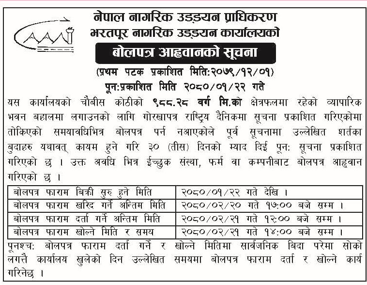 भरतपूर नागरिक उड्डयन कार्यालयको बोलपत्र आह्वानको सूचन