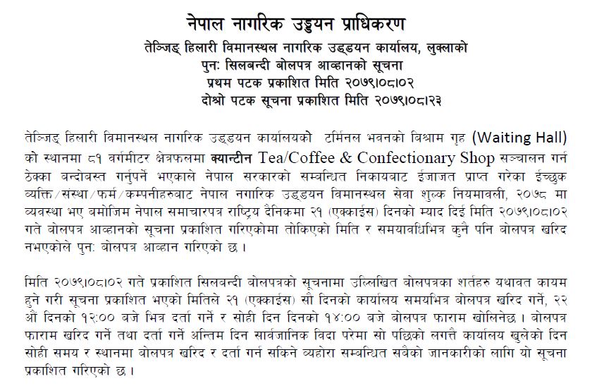 पुनः तेञ्जिङ् हिलारी विमानस्थलमा क्यान्टिन संचालन गर्ने सम्बन्धी शिलवन्दी बोलपत्र आव्हानको सूचना