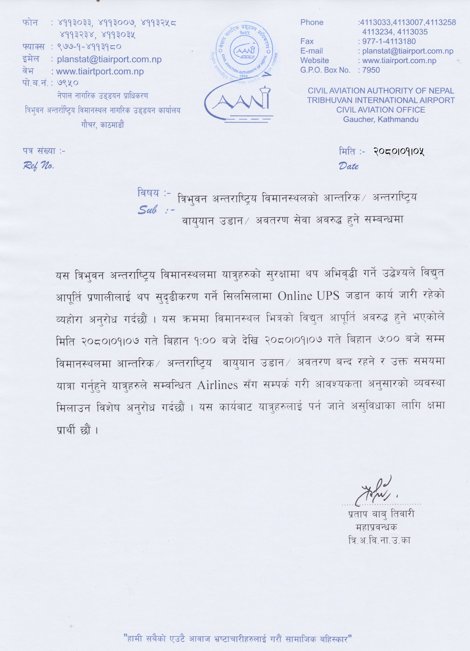त्रिभुवन अन्तर्राष्ट्रिय विमानस्थलको आन्तरिक / अन्तर्राष्ट्रिय वायुयान उडान /अवतरण सेवा अवरुद्ध हुने सम्बन्धमा