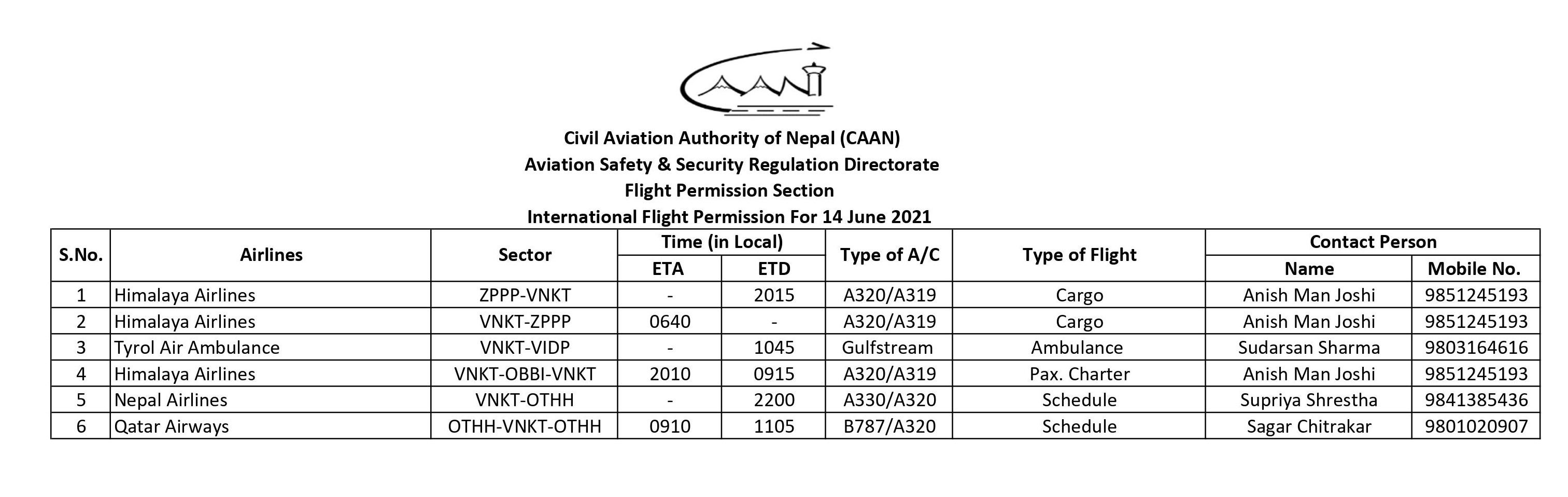 International Flight Permission For 14 June 2021