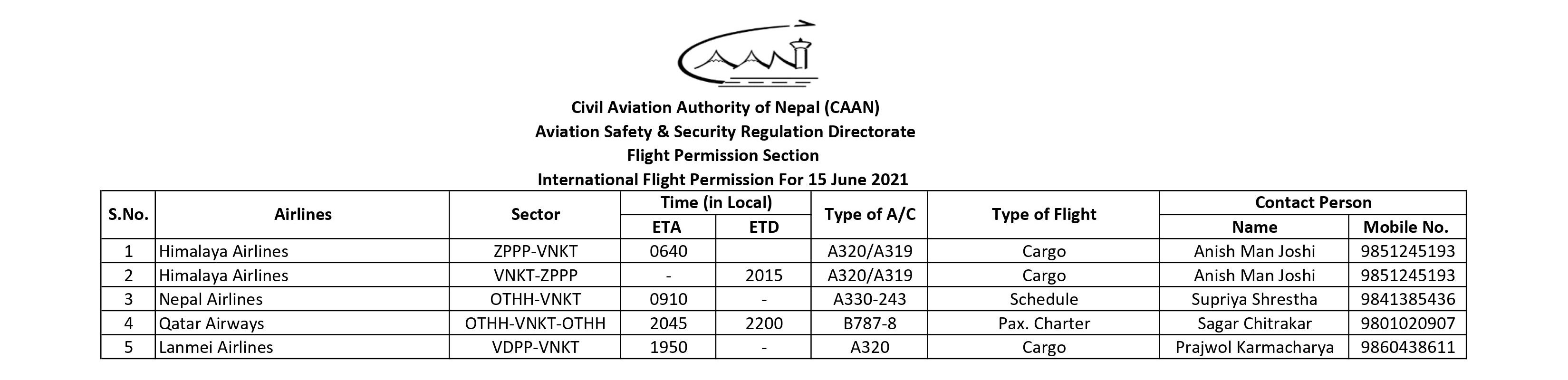 International Flight Permission For 15 June 2021