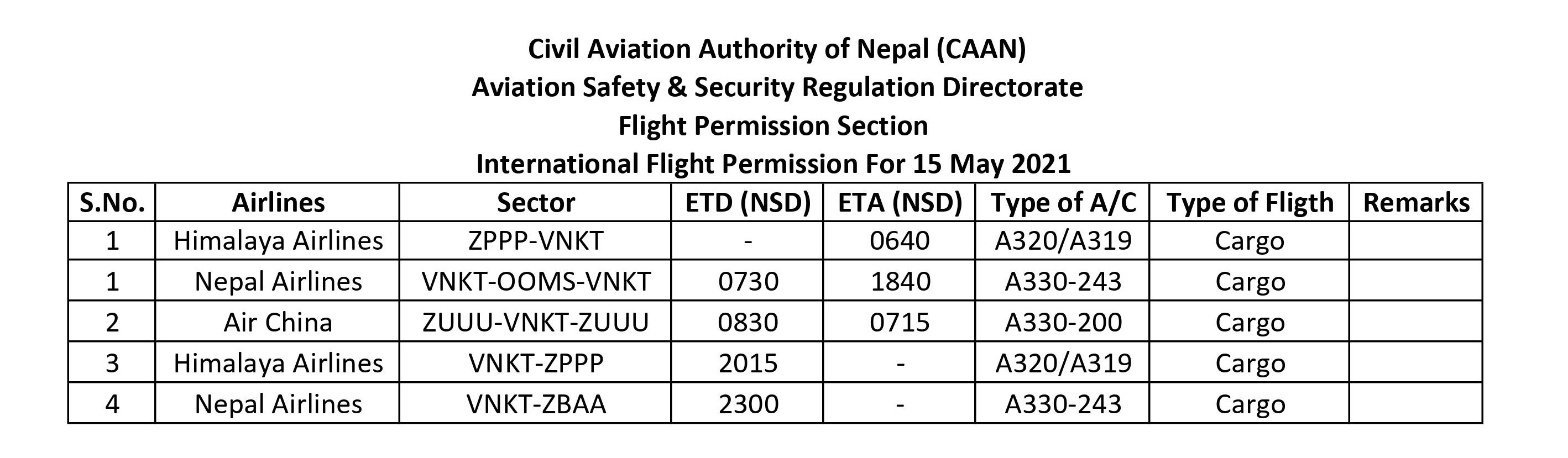 International Flight Permission For 15 May 2021