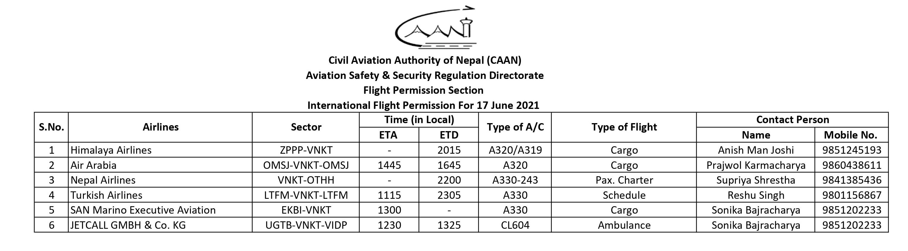 International Flight Permission For 17 June 2021