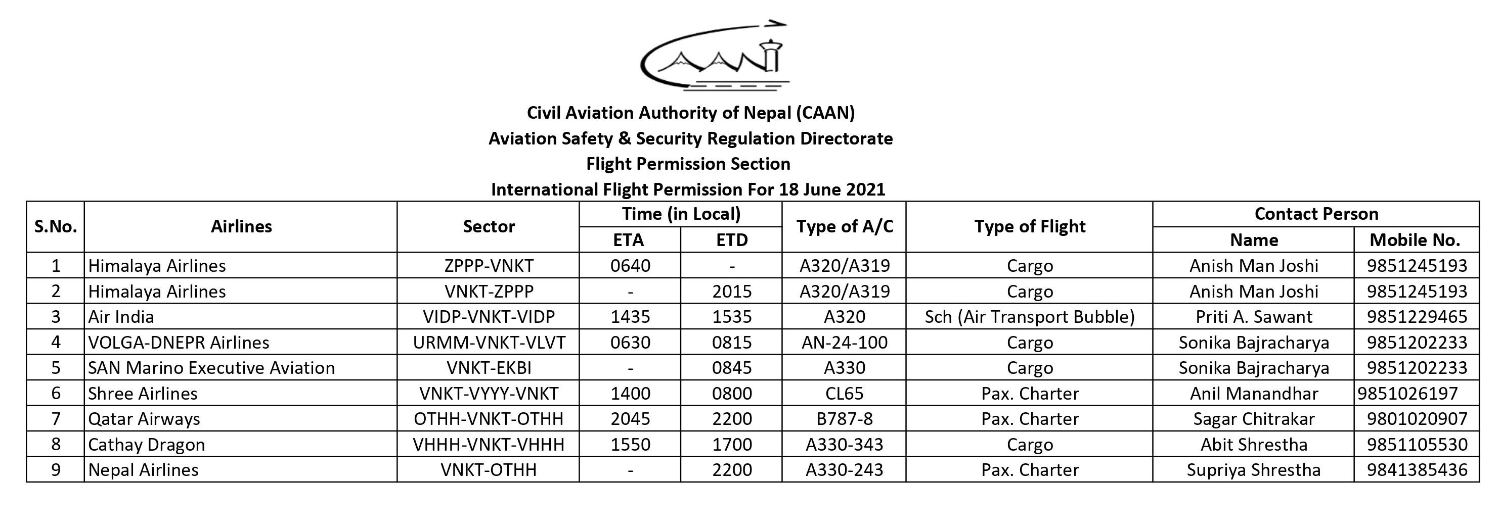 International Flight Permission For 18 June 2021
