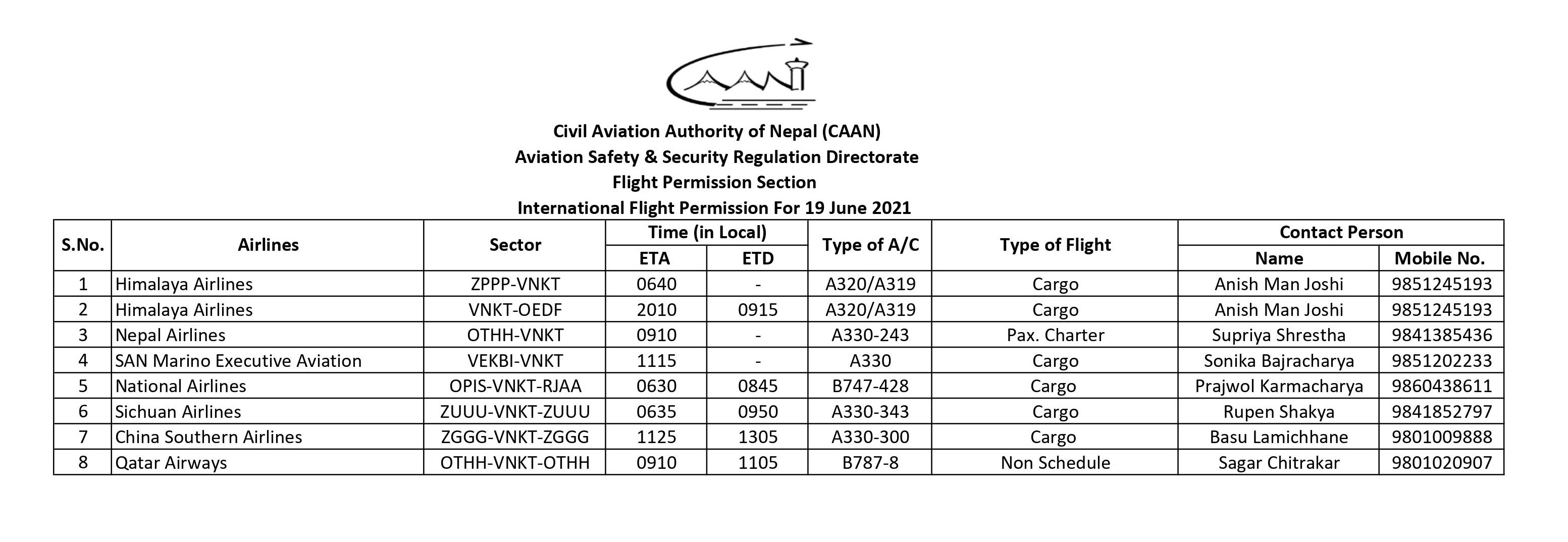 International Flight Permission For 19 June 2021