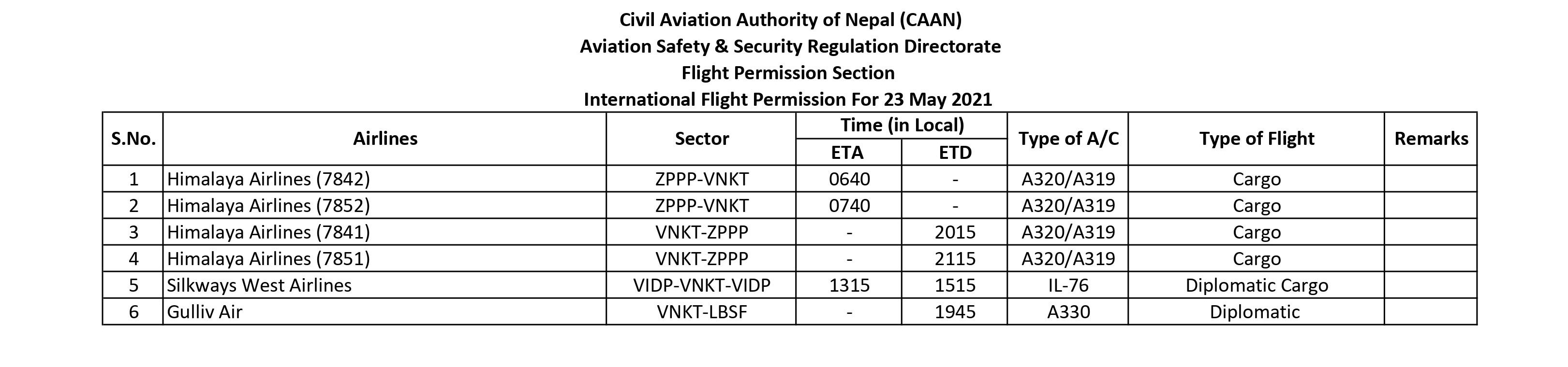 International Flight Permission For 23 May 2021