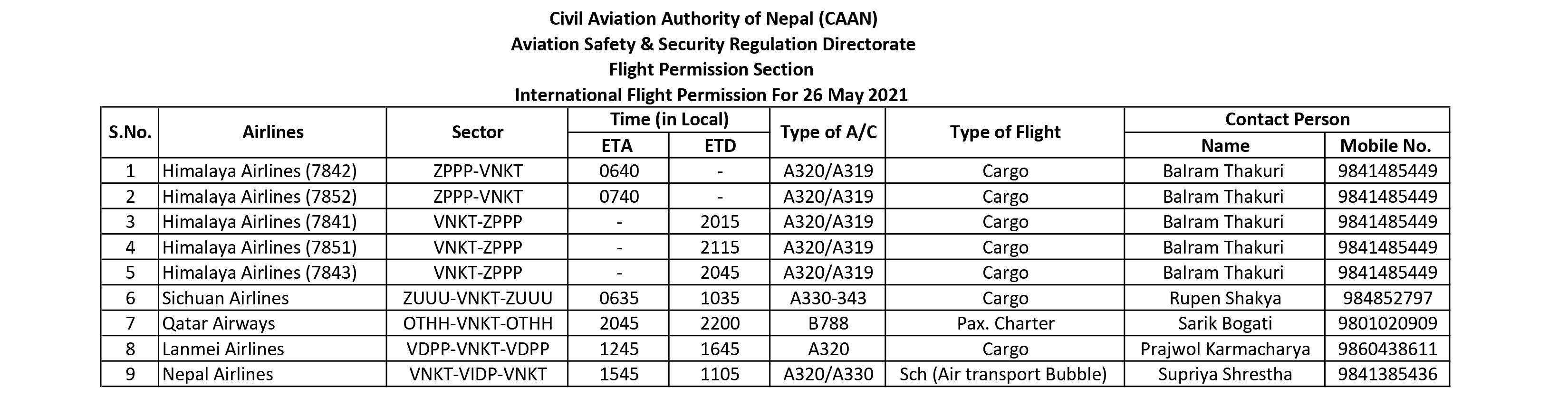 International Flight Permission For 26 May 2021