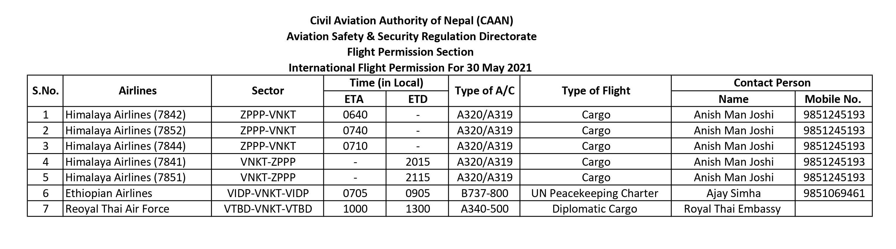 International Flight Permission For 30 May 2021