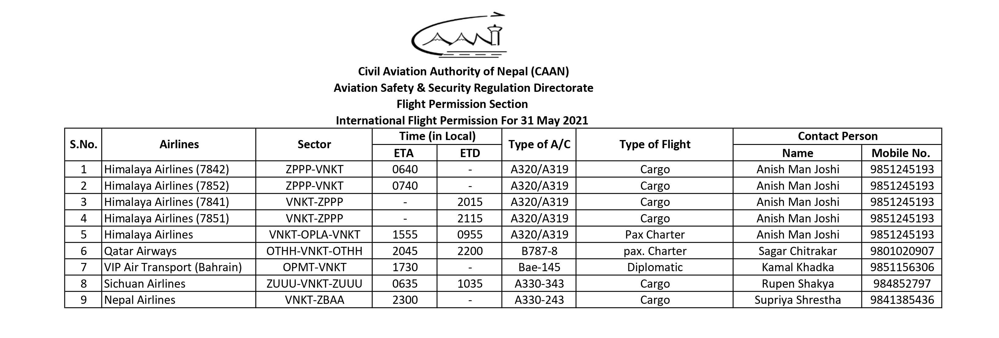 International Flight Permission For 31 May 2021