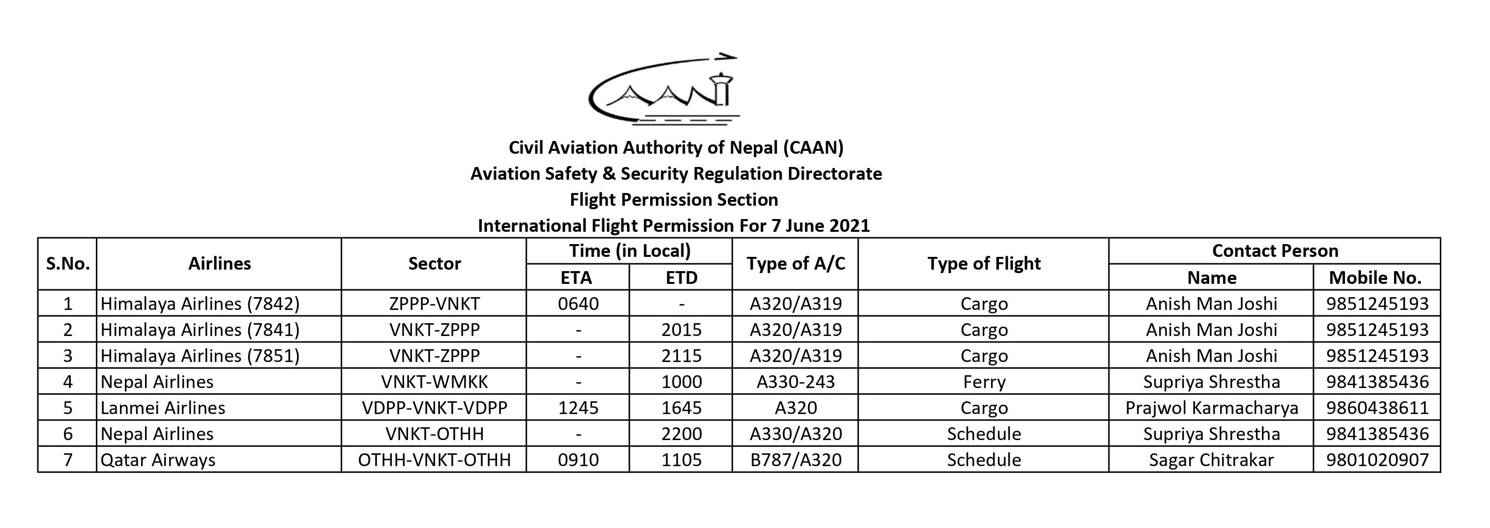 International Flight Permission For 7 June 2021