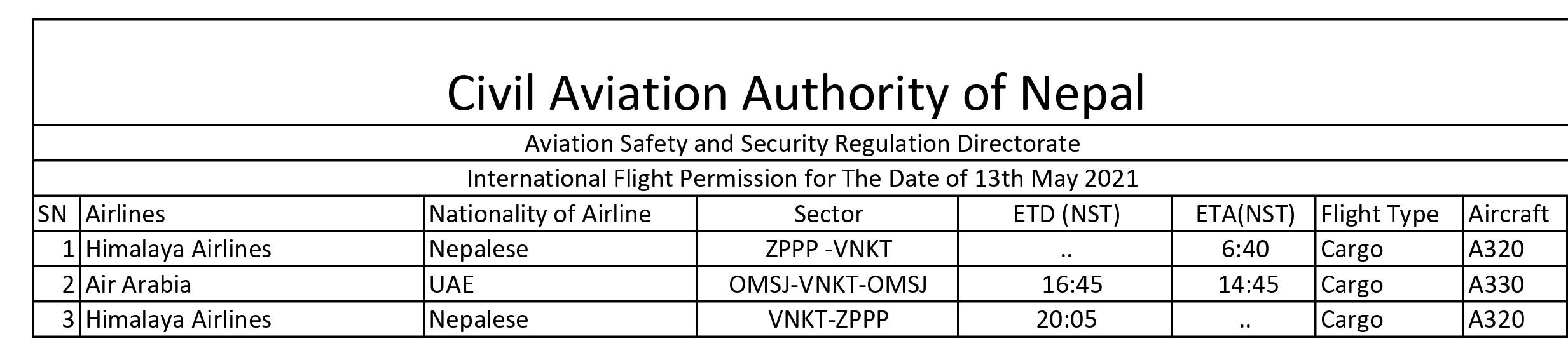 International Flight Permission for The Date of 13th May 2021