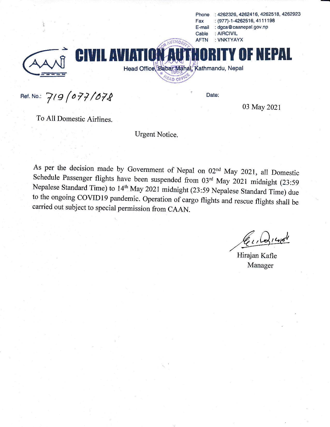 Urgent Notices regarding suspension of domestic and international flights.