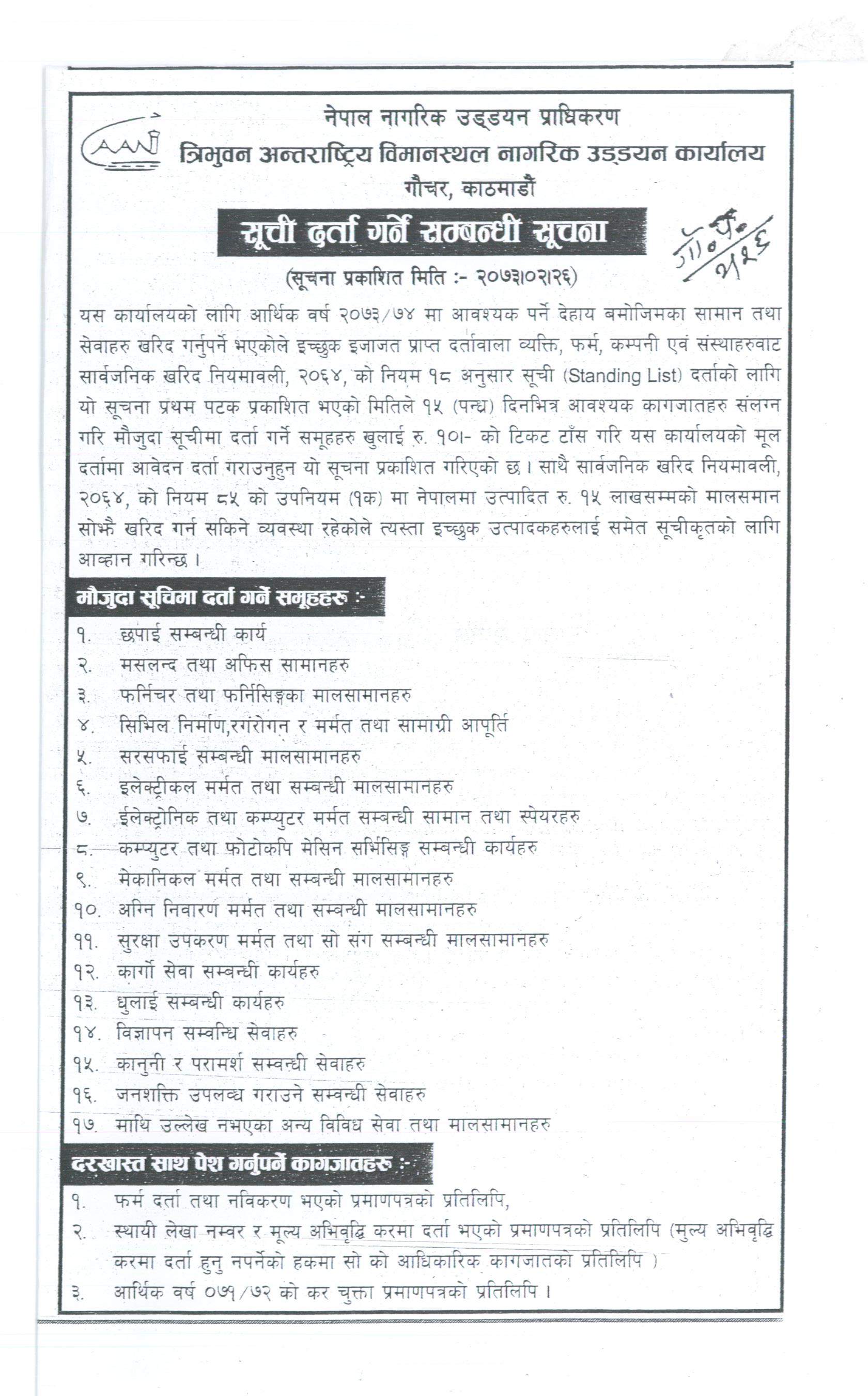 सूची दर्ता गर्ने सम्बन्धी सूचना मिति २०७३।०२।२६ त्रि.अ.वि.ना.उ.का.