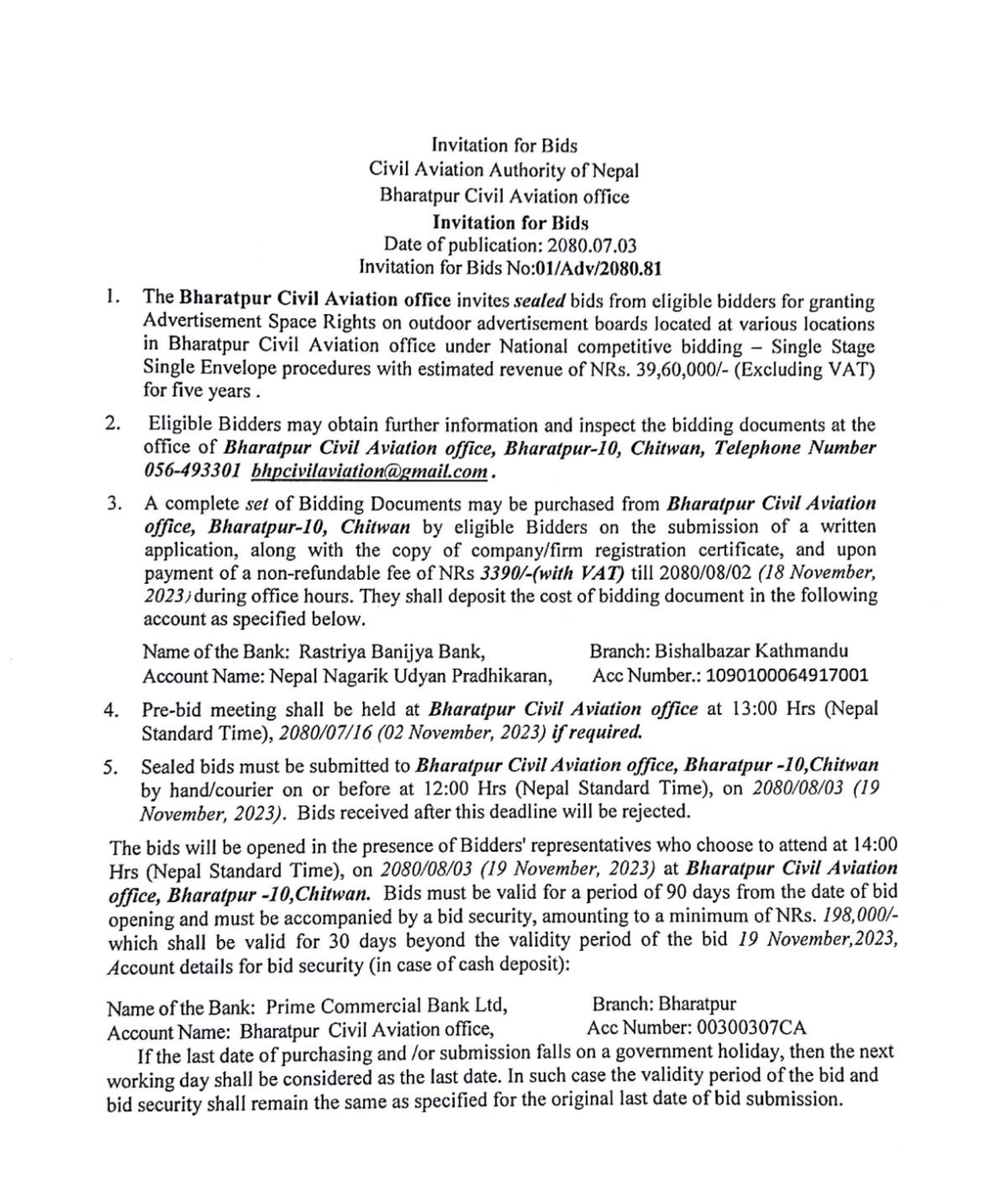 Invitation For Bids No: 01/Adv/2080/81 Bharatpur CAO