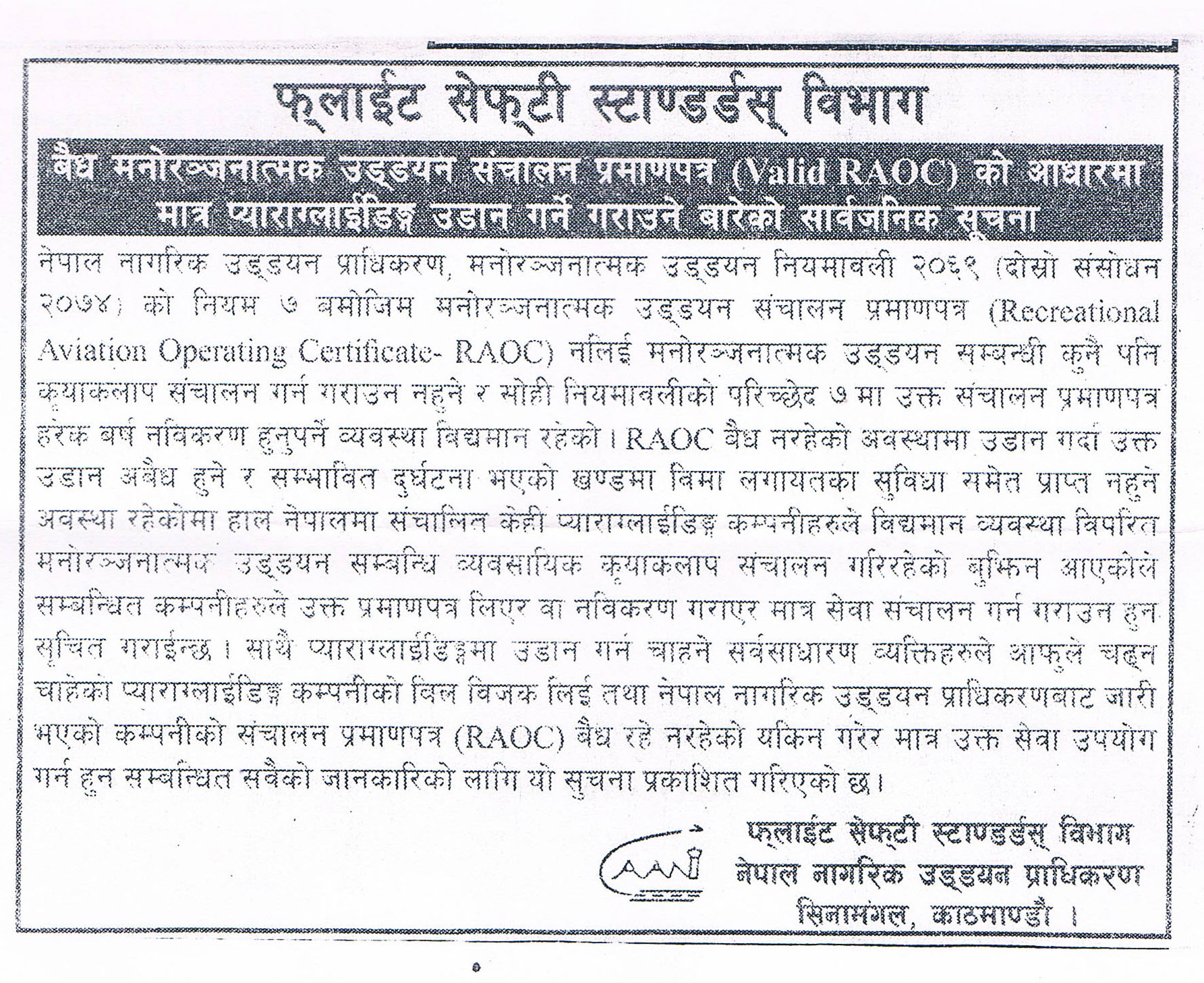 Valid RAOC को आधारमा मात्र Paragliding उडान गर्ने गराउने बारे सार्वजनिक सूचना