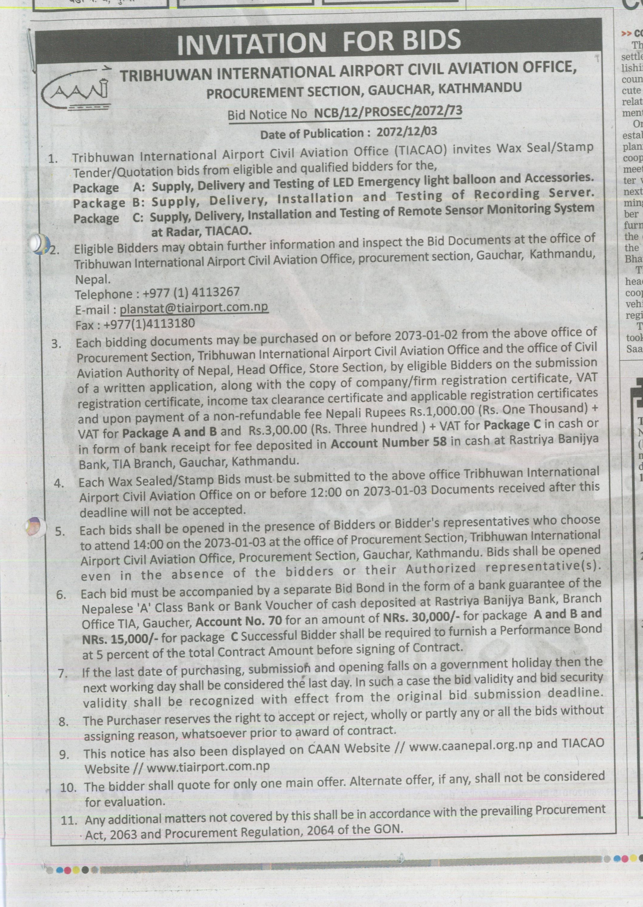 BID Notice No. NCB-12/PROSEC/2072/73- 2072.12.03-TIA