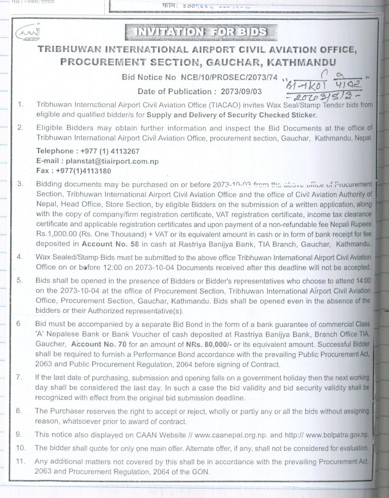 Bid Notice No.NCB 10/PROSEC/2073/74/TIA – Date 2073/09/03