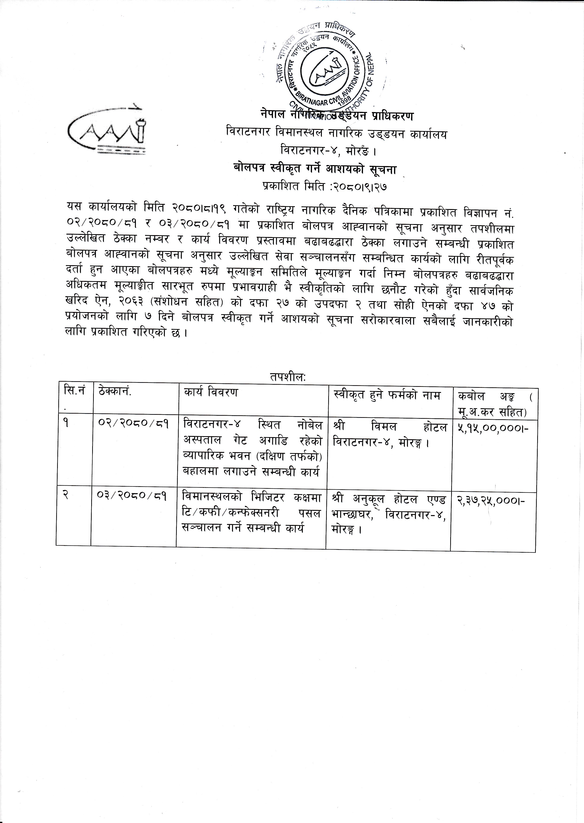 बोलपत्र स्वीकृत गर्ने आशयको सूचना (बिराटनगर न.उ.का.)