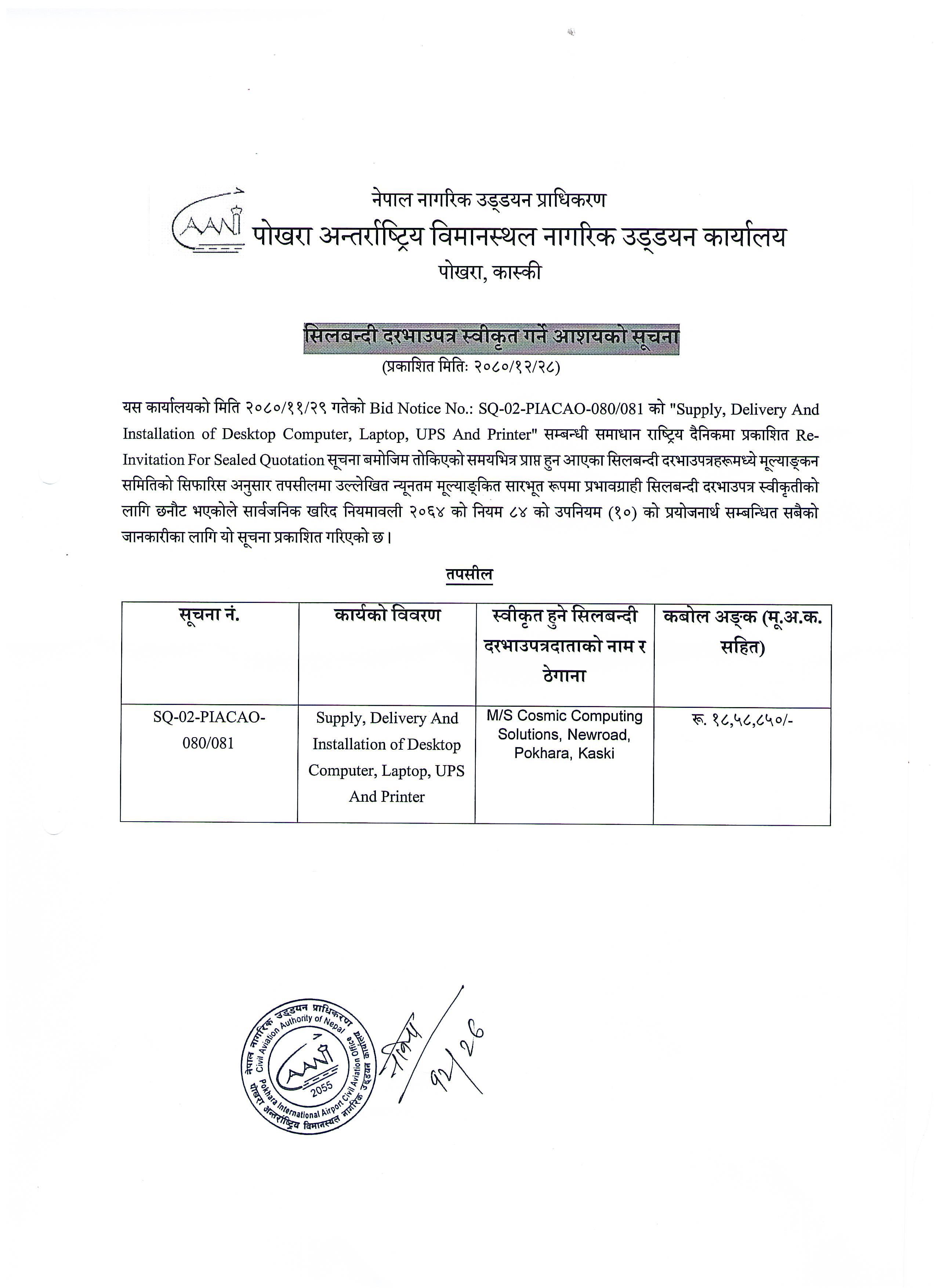 सिलबन्दी दरभाउपत्र स्वीकृत गर्ने आशयको सूचना (पो.अ.वि.ना.उ.का.)