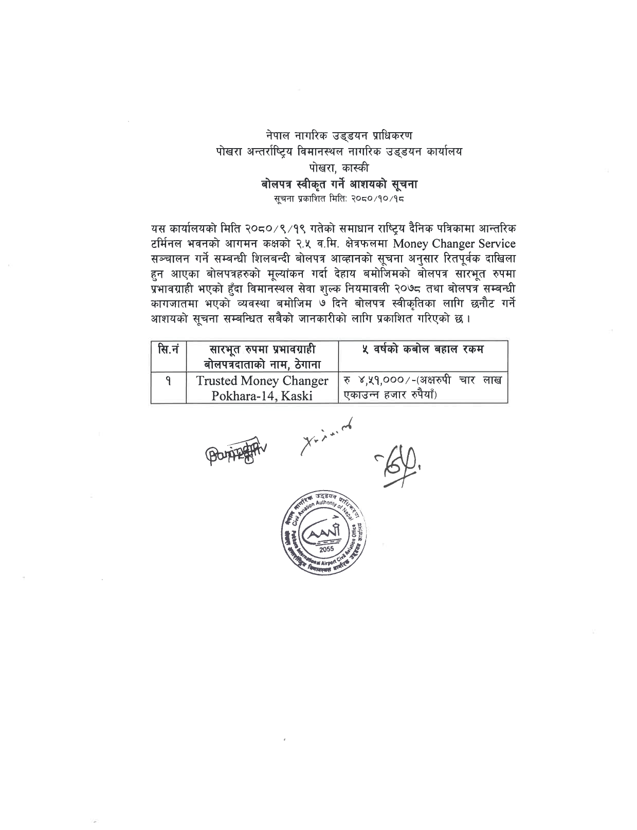 बोलपत्र स्वीकृत गर्ने आशयको सूचना (पो.अ.वि.न.उ.का.)