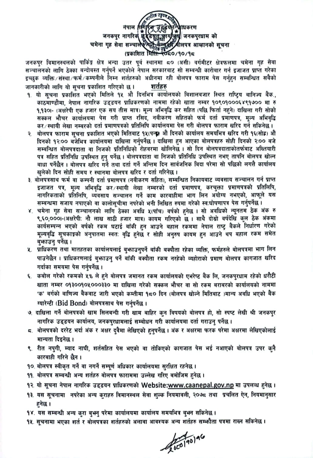 चमेना गृह संचालन सम्बन्धि बोलपत्र आह्वानको सूचना (जनकपुर न.उ.का.)