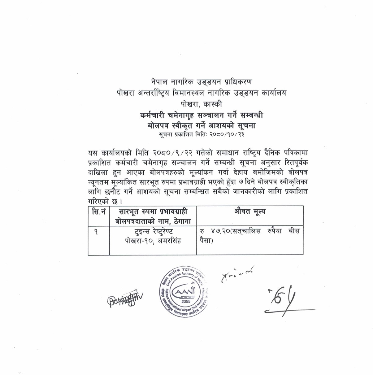 कर्मचारी चमेनागृह संचालन गर्ने सम्बन्धि बोलपत्र स्वीकृत गर्ने आशयको सूचना (पो.अ.वि.न.उ.का.)