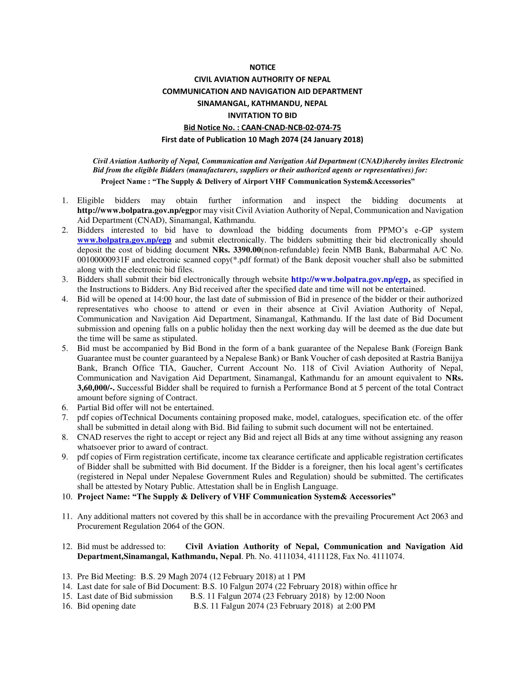 Invitation for Bids CAAN-CNAD-NCB-02-074-75