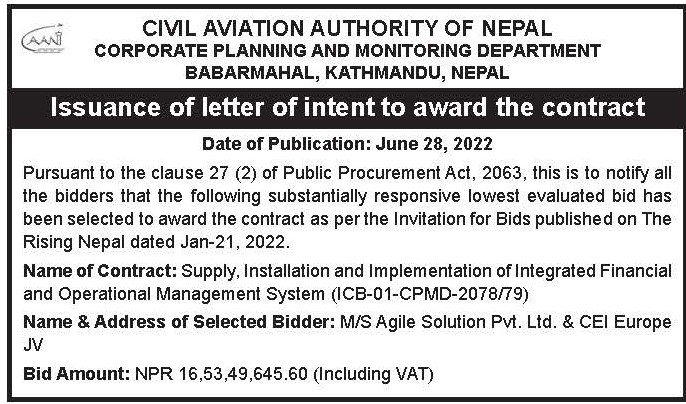 Issuance of letter of intent to award the contract
