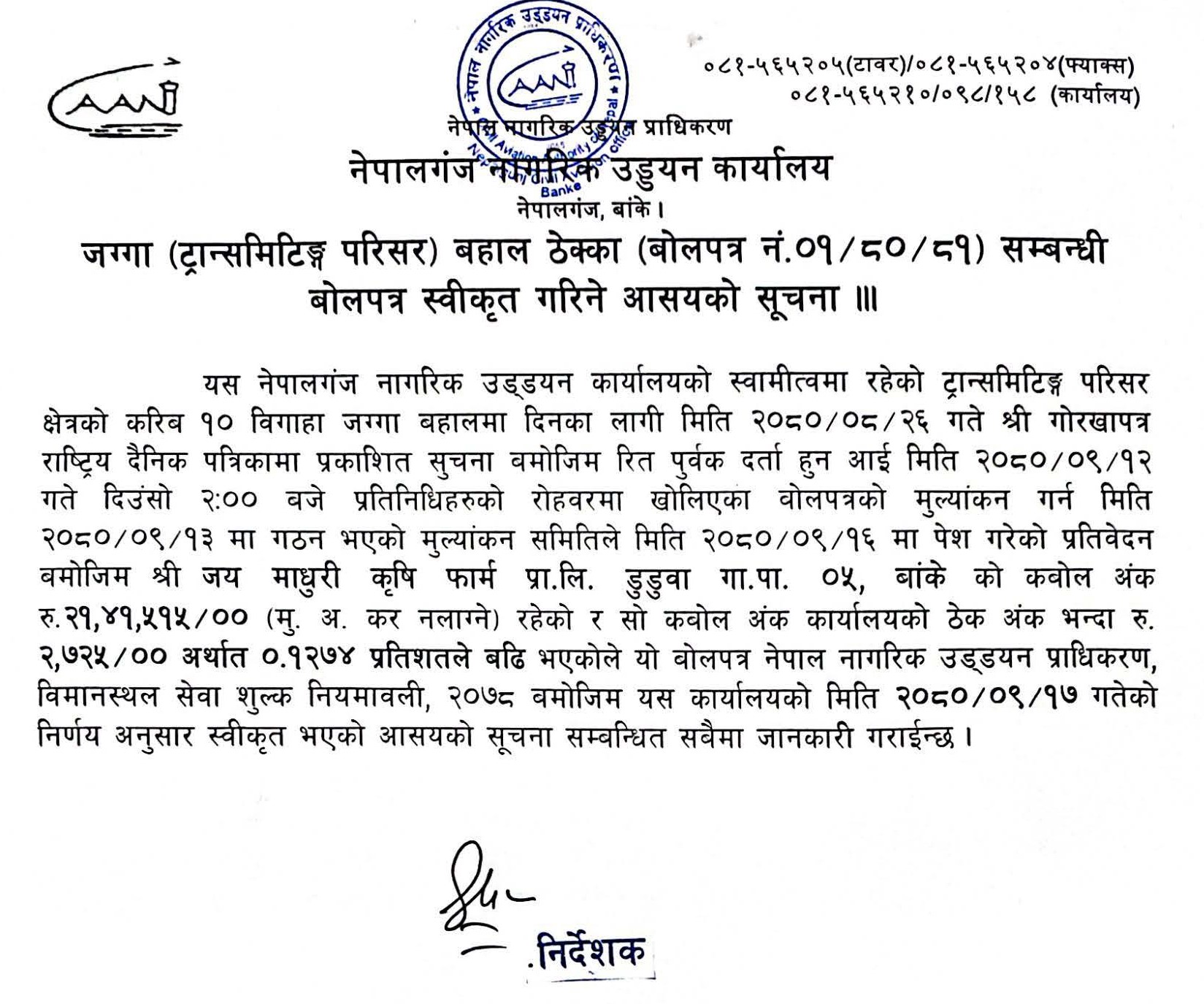 जग्गा (ट्रान्समिटिंग परिसर) बहाल ठेक्का आशयको सूचना नेपालगंज ना.उ.का.