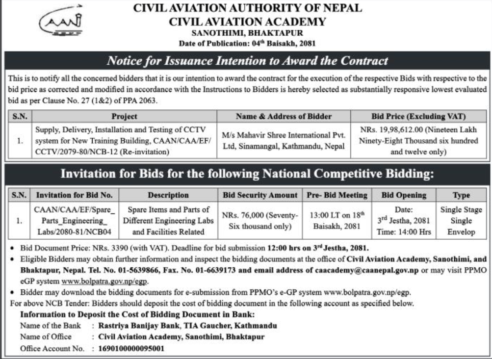 Notice related to NCB -004-2080-81( Spare Items) and Intention to Award related to NCB-12-2079-80(CCTV) (CAA)