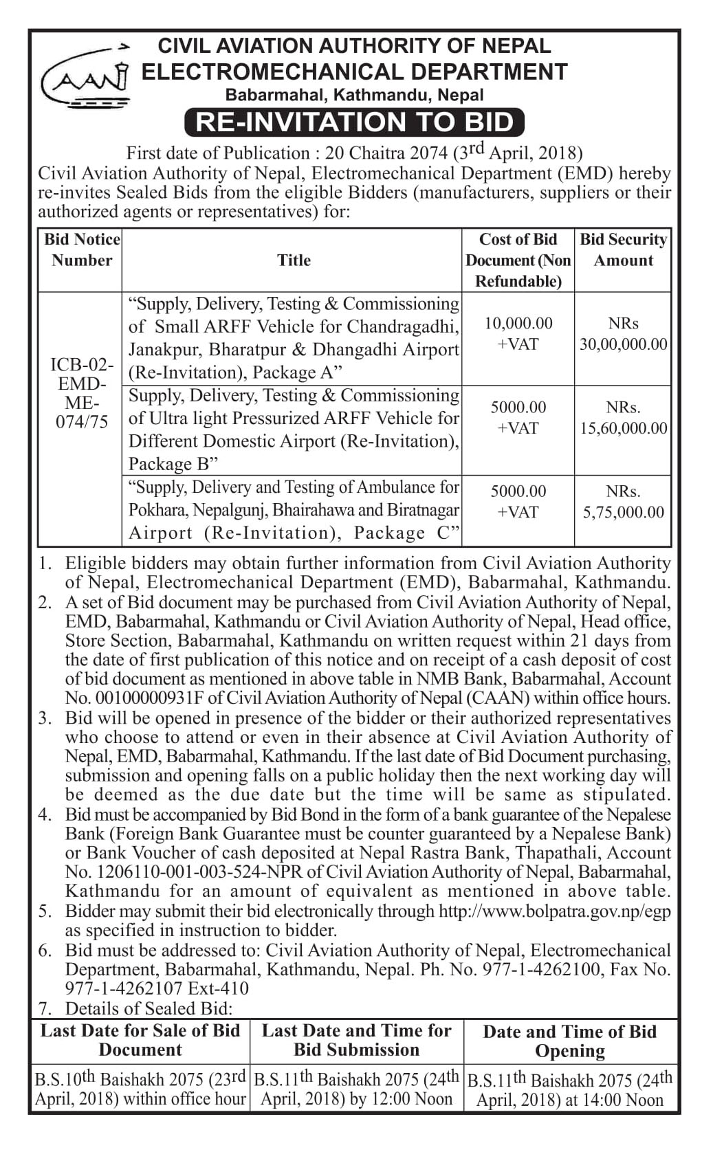 Re-Invitation to Bid ICB-02-EMD-ME-074/75