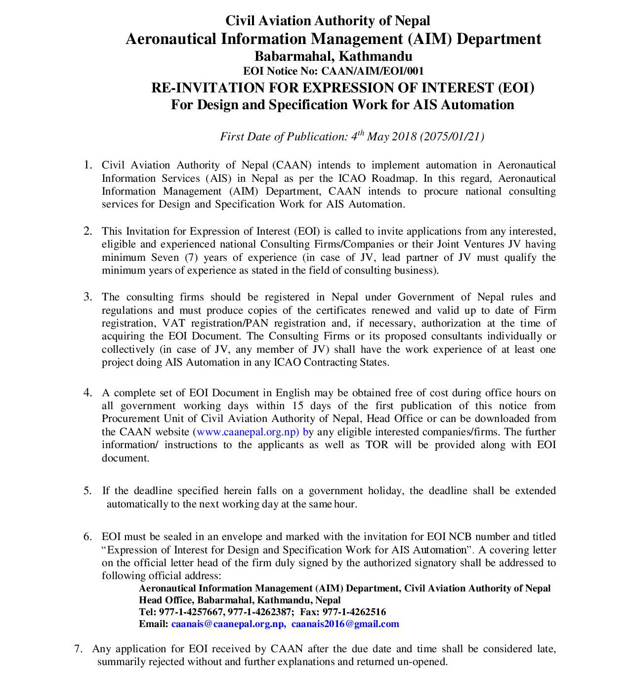 Re-Invitation for EOI For Design and Specification Work for AIS Automation