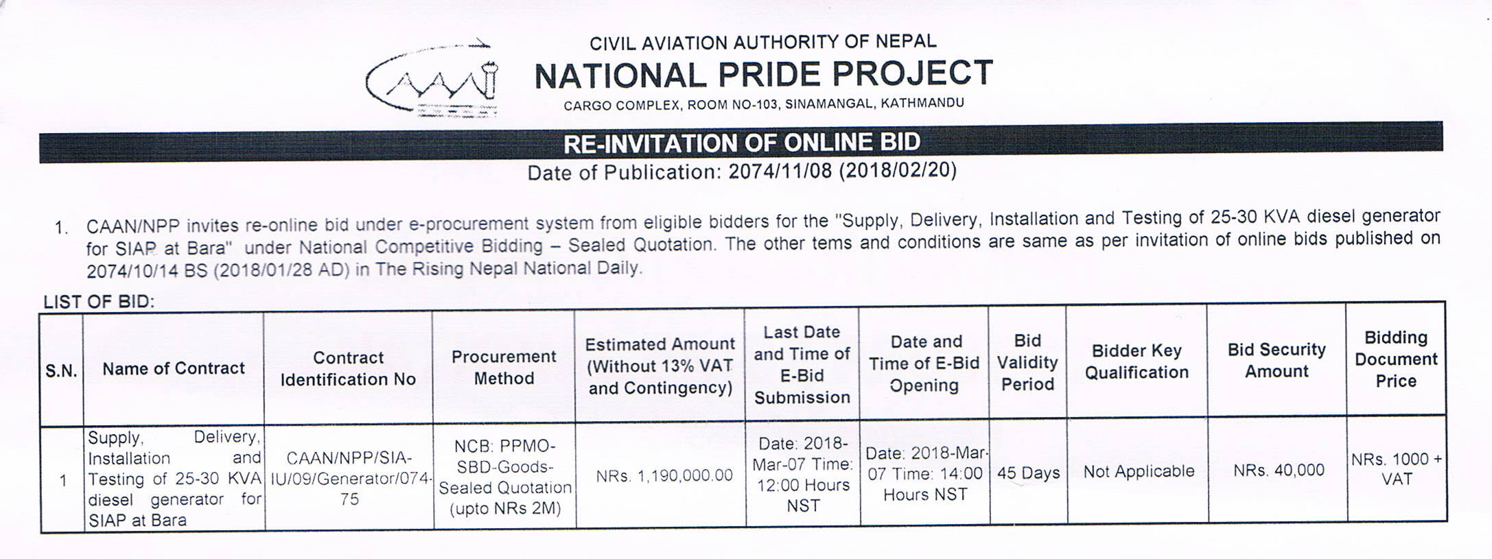 Re-Invitation of Online Bid CAAN/NPP/SIA-IU/09/Generator/074-75