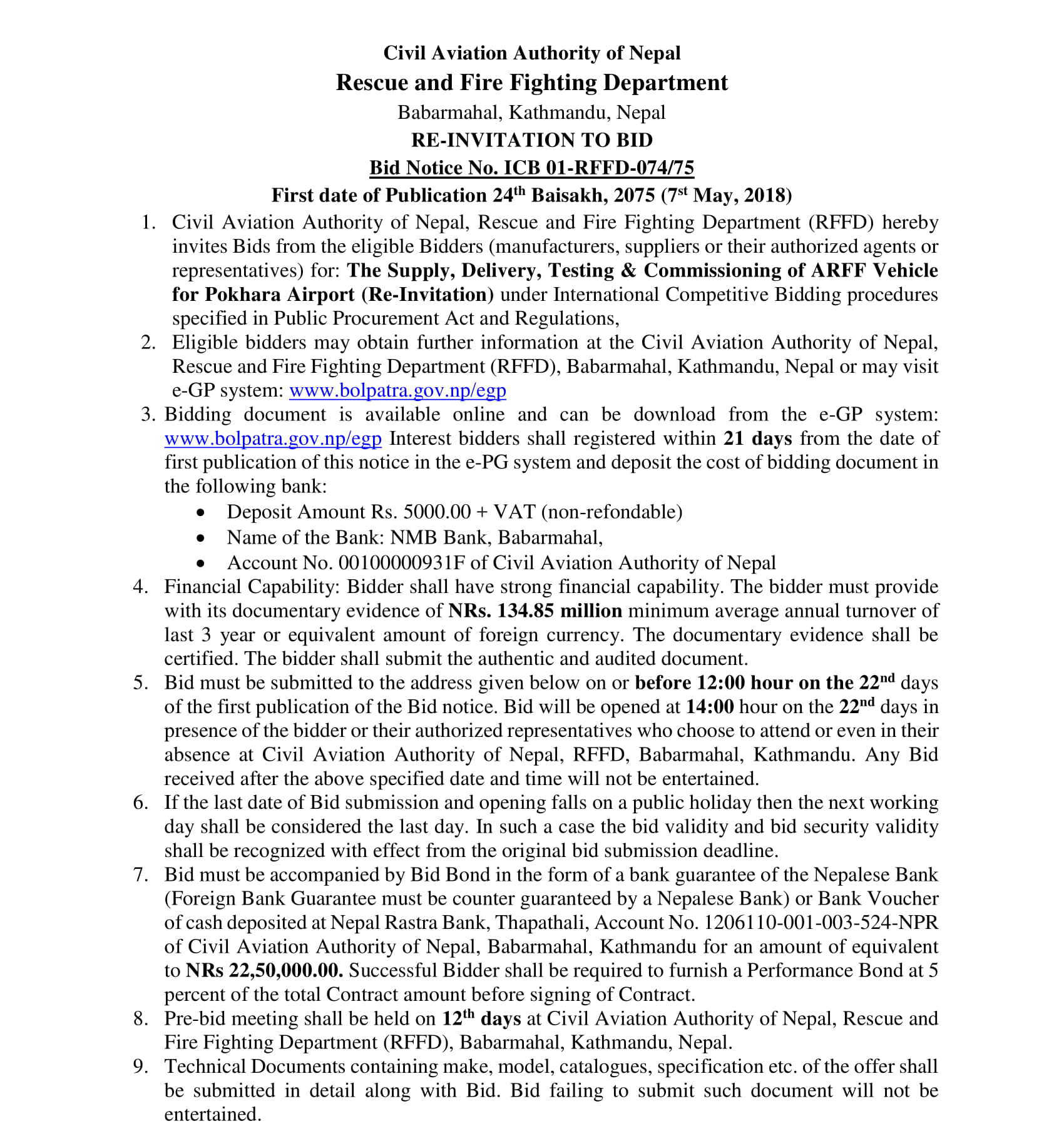 Re-Invitation for The Supply, Delivery, Testing & Commissioning of ARFF Vehicle for Pokhara Airport