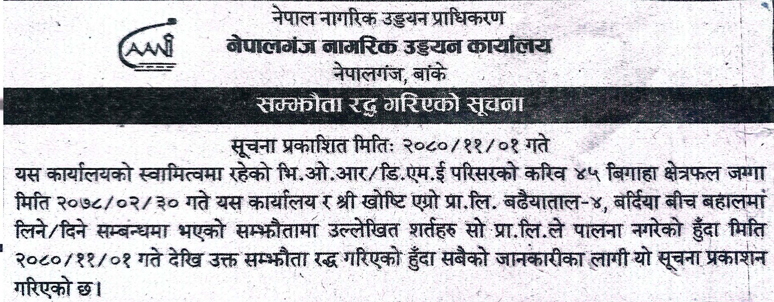सम्झौता रद्द गरिएको सूचना - नेपालगंज ना.उ.का.